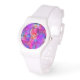I only have one complaint. I ordered the watch with clear case and strap, and what was sent was white case and strap. I'm going to keep it because 1) it looks very nice in white, and 2) it would take too long to get a replacement made and sent in time for my occasion. Aside from the mix up with the color, the watch does look very good in white. The purple dial is actually sparkly which did not show in the online images. That was a nice surprise. If you like Swatch watches this is very similar to those. It's 33.6mm in diameter, 10.5mm thick, and 40.6mm lug to lug. Stainless steel case back says 3ATM/30m WR, so no swimming or showering or submerging this one. If you like Woodstock, this is a great choice.