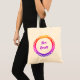 Artists sometimes just need a big tote bag for when they have odd shape "stuff" that they need to carry around but still need to take smaller, compact stuff as well. A big tote bag is the compromise. A colorful circle border frames the text, which is customizable for the customer to change.