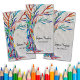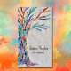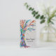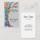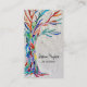 This unique business card is decorated with a mosaic Tree of Life design in rainbow colors on a soft gray background.
