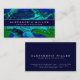 Stylish business card features an artistic abstract color splash composition in a blue and turquoise color palette with complimentary shades of teal and green with a custom name and title or role in a navy blue banner with white accents and text. The back of the card is plain and simple with coordinating white text on a complimentary blue background.