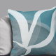 Modern throw pillow features an artistic abstract leaf design in a turquoise, gray and white color palette. This abstract composition is built on combinations of organic shapes and lines, which are overlapped and interlaced to form an intricate abstract pattern. The white and gray design compliments the turquoise blue background.