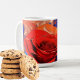 Artistic coffee mug features modern AI generated digital abstract marbled red and orange rose in full bloom on blue background.