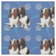 An artistic rendering of a pair of Basset hounds snuggling against a blue background with paw prints and tracks in gray, pink and blue.