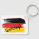 Keychain features artistic brushstroke version of the flag of Germany with customizable text overlay on black background.