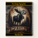 A beautifully crafted wooden piece features a majestic moose surrounded by trees, showcasing intricate details in dark wood tones.