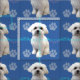 Cute artistic style Maltese dog on a blue background with paw prints and tracks in gray. pink and blue. The original photograph was modified to give it a painted appearance.