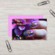 Beautiful artwork on fingernails is featured on this business card for a nail salon. The back is a bright orchid pink, and left plain, for more information or appointments. Very beautiful, professional, and eye-catching.