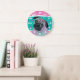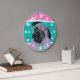 Artistic Pug Dog in pink and green turquoise on a pink, lilac, turquoise and white dots background clock