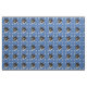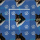 An artistic sketch of the head of a happy Rough Collie with a blue background decorated with paw prints and tracks in shades of gray, pink and blue. Design by Diane Blackman. The same design is available with other fun dog images.