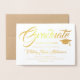 Artistic Script typography Photo College Graduation Announcement Card Invitation in horizontal orientation. Beautiful gold foil leaf, with mortarboard graduation cap icon logo. Wonderful and classic for any male or female graduate. Modern sophisticated graduation announcement is ideal for college level graduates or fancy high school students. Formal Classic Elegant design with stately script font writing. Great cheap inexpensive option in place of official school announcements. Formal to traditional and classic graduation invite suitable for anyone, whether grad school, trade school, nursing, medical or law school.