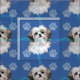 This fun, cute artistic style Shih Tzu head smiles against a background of blue with paw prints and tracks in gray, lue and pink. Design by Diane Blackman.