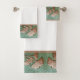 This elegant Bath towel set features a Gingko leaf design. The ginkgo leaf is a classic Arts and crafts motif. This particular pattern of gingko leaves comes from a variation (digitally altered) on handmade tile from Oregon tile maker Fay Jones Day. The gingko leaves are metallic copper. the background is a textured cool light green. This will be a perfect addition to your Craftsman bungalow Bathroom.