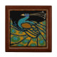 The lid of this hinged, felt-lined, lacquered Wood Box is adorned w/ ceramic tile inlay that features a vibrantly colored image of a Peacock in profile inspired by a popular Arts & Crafts decoration from the early 1900’s. Revived and updated by digital artist, Leslie Sigal Javorek, the colorful areas (turquoise, green, gold) have been enhanced w/subtle shading producing the illusion of depth & textured surfaces. Perfect for jewelry, hankies, keepsakes, etc.