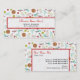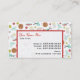 Business cards featuring an arts and crafts themed pattern . Design consists of a ball of yarn with knitting needles, buttons, scissors, a bottle of glitter, a bottle of glue, ribbon, and a hot glue gun. Design has a retro orange, yellow, red, and blue / turquoise color scheme.
