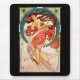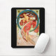 1898 Art Nouveau lithograph poster by Czech artist, Alphonse Mucha (1860-1939). Beautiful woman in a red dress, flowers in her long, flowing, bright red hair, her back arched, looking over bared shoulders, standing on her toes.