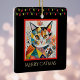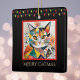 This artsy bohemian cat ornament is great for cat lovers or anyone who enjoys a unique twist on the usual Christmas decoration. It features an artisan style cat with dots and blocks of color in red, orange, dark teal green, mustard, and black, with the slogan "Merry Catmas" below in stylish gold vintage lettering. If you prefer different text, such as the name of your or your recipient's cat, you can easily edit it. The background is black nd red, and ornament is adorned with twinkling Christmas lights above. Artwork acquired via: https://grafixdeals.com/