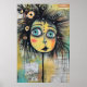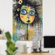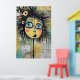 A colorful and whimsical character with exaggerated, large eyes and a crown of flowers and butterflies gazes out from the frame. The background is a collage of various texts and symbols suggesting a fusion of different cultures and ideas.