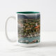 Souvenir coffee mug, featuring a panoramic view of sailboats and other small vessels resting in a harbor at Aruba, in the Southern Caribbean. The tropical island's year round mild climate attracts visitors sailing in via cruise ships for a day and flying in for longer visits.