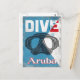 Aruba Caribbean vintage scuba mask travel poster design. A blue and white diver down flag background with a retro scuba mask and word "Dive" at the top.