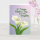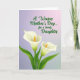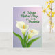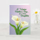 This greeting card features two trumpet-shaped white flowers in the lower half, rising from a cluster of rich green leaves with gently curving stems that lean toward each other like close companions ❤️. Each bloom has a creamy white petal form that wraps around a bright orange center, adding a cozy spark against the cooler tones. Behind them, the background fades from soft lavender near the bottom into a light blush pink toward the top, giving the scene a calm, affectionate glow. In the upper right, the message “A Warm Mother’s Day for a lovely Daughter” appears in flowing green lettering, standing out clearly against the pastel sky. The placement leaves plenty of open space around the words, so the note feels airy rather than crowded. Subtle shading along the petals and leaves adds depth, making the flowers look gently sculpted and touchable 🌼. The two white blooms sit side by side above the green foliage, their orange centers pointing upward against the lavender-to-pink gradient.