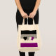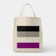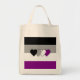 Tote bag with asexuality pride flag with black, gray, white and purple striped pattern with hearts design