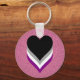 Basic Button Keychain with hearts design in colors of asexuality; pink, yellow and blue stripes pride flag, rainbow love design, on pink background