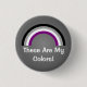 Round Button with asexuality rainbow stripes of black, gray, white and purple; ace pride flag design on gray background, "These Are My Colors" template text, by pinkbrickroad