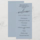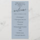 A slate blue birthday party program with elegant fonts and a delicate calligraphy script writing welcome across the top of the program. Add your program, the date, and the name of the person celebrating their birthday. Clean, simple, timeless, and elegant.