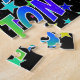 This fun and lively birthday-themed jigsaw puzzle design has the message "HAPPY BIRTHDAY, ASHTON" with the characters having a colorful rainbow spectrum inspired gradient pattern, in addition to an exciting star shapes background pattern. A vibrant puzzle like this might be used to send birthday wishes to somebody named Ashton. [~Z0000468]