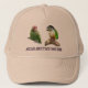 A green cheek conure and a cherry headed conure, also known as a red masked parakeet, are shown together on this attractive trucker hat