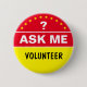 Buttons: Ask me about - VOLUNTEER - personalised button text. Ask your questions about different topics. Text can be personalised to topics, persons name. Great for festivals, events, help desk person, information assistant, school debates - clothing/bag button.