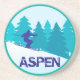 This coaster features a circle image in teal and blue of a silhouette snow skier in front of pine trees on a snowy mountain. The bottom has distressed text in blue that says ASPEN. Perfect for the skier who loves the slopes of Aspen, Colorado. *Clip art used in this design is copyrighted by Encore Software, Inc., which permits use to its licensors. All rights reserved.