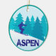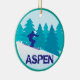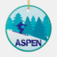 What better place to spend a Christmas holiday than on the ski slopes of Aspen, Colorado? Even if you can't be there in person, this keepsake ornament can take you there in spirit. It features a circle image in teal and blue of a silhouette snow skier in front of pine trees on a snowy mountain. The bottom has distressed text in blue that says ASPEN. The back side has your custom text in white on a matching teal background. *Clip art used in this design is copyrighted by Encore Software, Inc., which permits use to its licensors. All rights reserved.