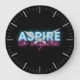 Modern and fun wall clock design with an inspirational message for all features a black background with white clock face and "Aspire to Inspire" in neon blue and pink center text.