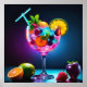 A vibrant cocktail glass filled with ice cubes and an assortment of fresh fruits is illuminated under colorful lighting. Various fruits surround the glass, adding to the refreshing and lively ambiance.