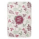 Illustrative surface pattern design of assorted leaf silhouettes in reds and greens on a cream color background with initial center to personalize.