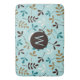 Illustrative surface pattern design of assorted leaf silhouettes in teal, cream, gold and brown on a light teal background with initial center in light teal on brown to personalize.