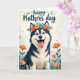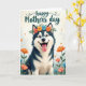 The front design shows a friendly dog portrait centered on the card, with a deep charcoal-and-white coat that looks soft to the touch and a gentle, welcoming expression that feels like a warm hello ❤️. A ring of flowers rests on its head, mixing orange and coral blooms with small blue blossoms and fresh green leaves, like a sweet gift offered with affection. The dog’s bright blue eyes catch the light, and its slightly open mouth with a pink tongue adds an easygoing, companionable charm. Below the portrait, a scattering of matching stylized flowers spreads across a green foreground, giving the scene a cozy, garden-like setting 🌼. The background stays a creamy off-white with a faint texture, keeping the focus on the face and floral crown. Small orange asterisk-like marks are sprinkled around like tiny confetti, adding a light, celebratory sparkle. Near the top, a short message is placed in flowing lettering, colored in a deep tone that stands out clearly against the pale backdrop. The floral crown shows orange, coral, and blue petals tucked among leafy greens above the dog’s alert ears.