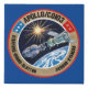 This is the American crew insignia of the joint United States-USSR Apollo-Soyuz Test Project (ASTP). Of circular design, the insignia has a colorful border area, outlined in red, with the names of the five crew members and the words Apollo in English and Soyuz in Russian around an artist's concept of the Apollo and Soyuz spacecraft about to dock in Earth orbit. The bright sun and the blue and white Earth are in the background. The white stars on the blue background represent American astronauts Thomas P. Stafford, commander; Vance D. Brand, command module pilot; and Donald (Deke) K. Slayton, docking module pilot. The dark gold stars on the red background represent Soviet cosmonauts Aleksey A. Leonov, commander, and Valeriy N. Kubasov.