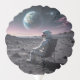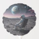 An astronaut in spacesuit sitting in a lawn chair on the moon.