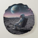 An astronaut in spacesuit sitting in a lawn chair on the moon.