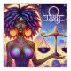 Horoscope Libra Acrylic Print. Ai art depicting a beautiful African-American woman with colorful purple dreadlocks holding a scale with a Libra symbol above it.
