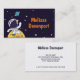 Business cards with a dark blue background with yellow stars scattered around. Layered over top is an illustration of a spaceman wearing a white astronaut suit floating above the moon. Waving hello as he explores space. Off in the distance is a planet with rings.