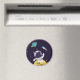 A magnet with a dark blue background with yellow stars scattered around. Layered over top is an illustration of a spaceman wearing a white astronaut suit floating above the moon. Off in the distance is a planet with rings and a rocket ship flying off into the sky looking for new worlds to explore.