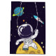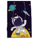 Gift bag with a dark blue background with yellow stars scattered around. Layered over top is an illustration of a spaceman wearing a white astronaut suit floating above the moon. Off in the distance is a planet with rings and a rocket ship flying off into the sky looking for new worlds to explore.