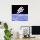Mission Specialist Bruce McCandless II ventured further away from the confines and safety of his ship than any previous astronaut ever has. This space first was made possible by the Manned Manuevering Unit or MMU, a nitrogen jet propelled backpack. After a series of test maneuvers inside and above Challenger's payload bay, McCandless went "free-flying" to a distance of 320 feet away from the Orbiter. The MMU is controled by joy sticks positioned at the end of the arm rests. Moving the joy sticks left or right or by pulling them fires nitrogen jet thrusters propelling McCandless in any direction he chooses. A still camera is mounted on the upper right portion of the MMU. This stunning view shows McCandless with the MMU out there amongst the black and blue of Earth and space.