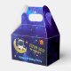 Astronaut Outer Space Birthday Party Favor Boxes feature an astronaut posing from a crescent moon, with stars around him, a rocket ship and Saturn. Set on a beautiful blue background of starry skies. Customizable text says, Thank you for coming to". Customizable text below says, "Ethan's 6th Birthday".