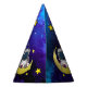 Astronaut Outer Space Kids Party Hat - On a beautiful background of the starry night sky, an astronaut is posing, nestled in a crescent moon, surrounded by stars. The astronaut image appears in 3 places around the hat. On the front at the peak is a rocket ship and a star. The front of the hat has customizable text at the bottom that reads, "Happy Birthday, Ethan"