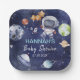 Have this galaxy planet kids baby shower party paper plates for your child's outer space theme birthday party. Illustration of watercolor planets and rockets. The text under them says "Hannah's Baby Shower". Add your children's name here to customize the design.