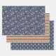 Sloth wrapping paper sheets with three matching patterns: sloth astronauts floating around in space among planets, shooting stars, and spaceships; retro stripes in blue, red, yellow, and off-white; and a space rocket pattern against a dark blue background. Perfect for kids birthdays and baby showers.